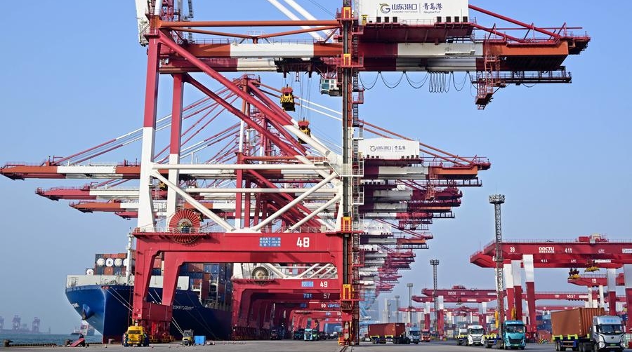 This photo taken on April 30, 2025 shows a container dock of Qingdao Port in Qingdao, east China's Shandong Province. [Photo/Xinhua]
