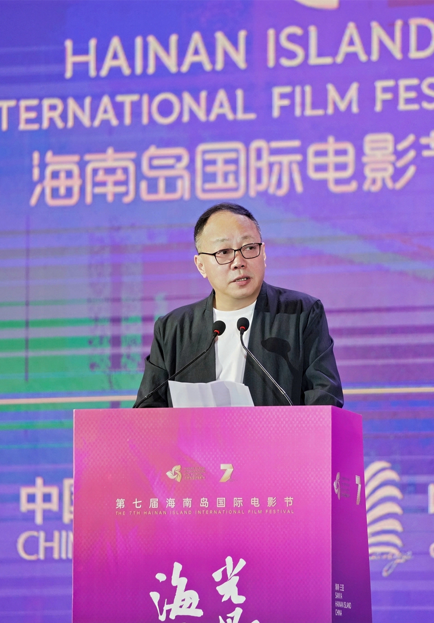 Fu Ruoqing, chairman of China Film Group Corporation, speaks at the Golden Coconut Main Forum during the seventh Hainan Island International Film Festival (HIIFF) held in Sanya, Hainan province, Dec. 4, 2025. [Photo courtesy of HIIFF Organizing Committee]