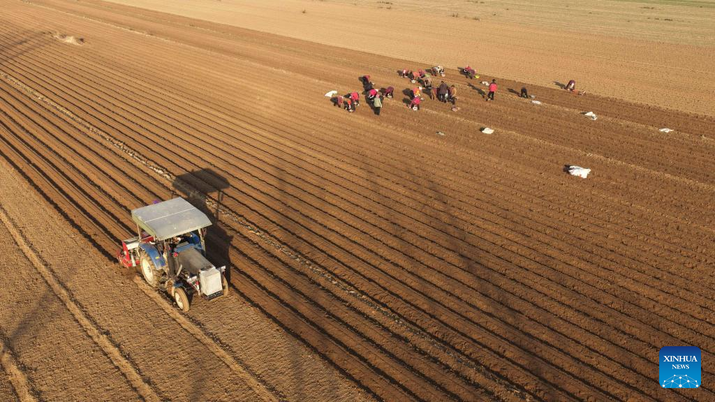 An aerial drone photo taken on Dec. 6, 2025 shows farmers planting crops of Chinese herbal medicine in Liaocheng city, east China's Shandong province. [Photo/Xinhua]