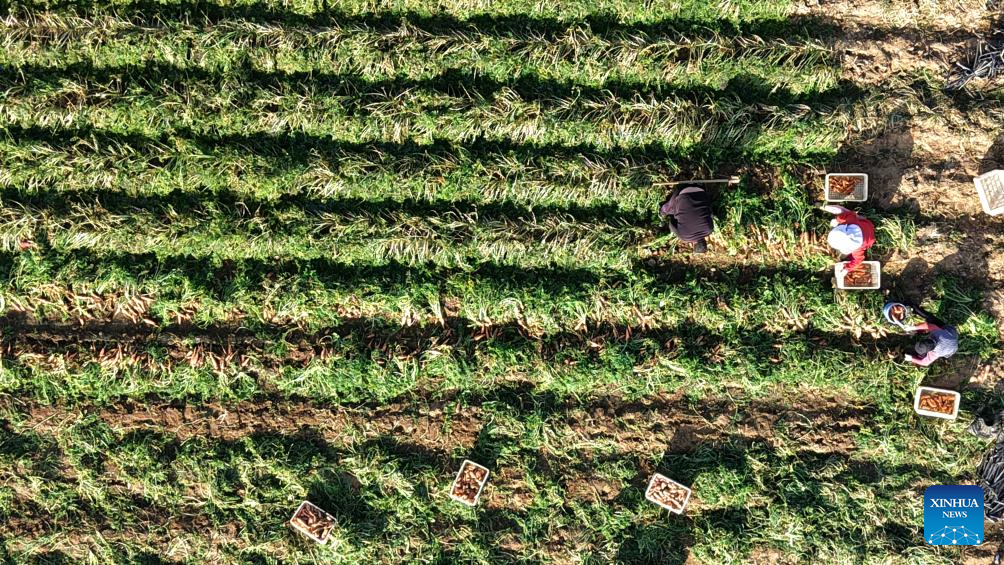 An aerial drone photo taken on Dec. 6, 2025 shows farmers harvesting carrots in Linyi city, east China's Shandong province. [Photo/Xinhua]