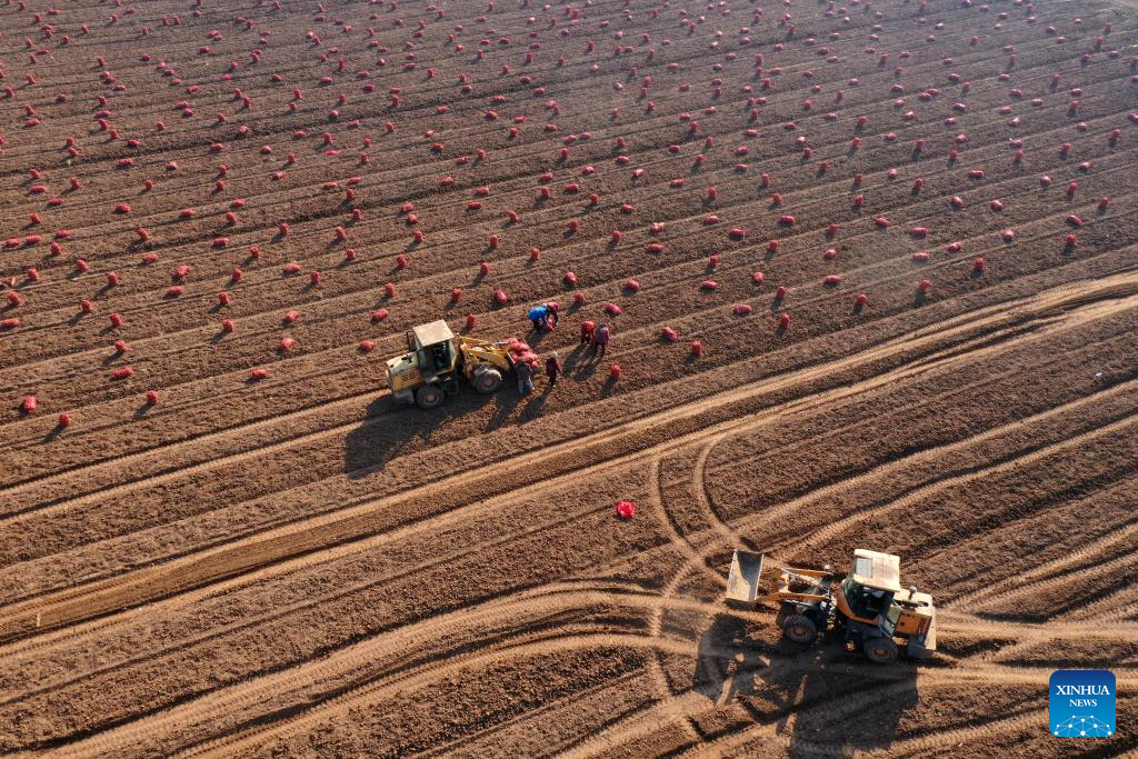 An aerial drone photo taken on Dec. 6, 2025 shows farmers loading the newly harvested Chinese herbal medicine crops onto trucks in Qinyang city, central China's Henan province. [Photo/Xinhua]