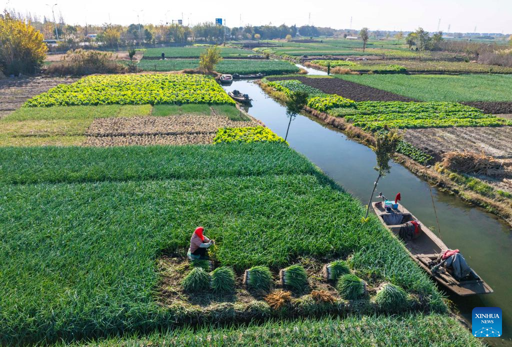 An aerial drone photo taken on Dec. 6, 2025 shows farmers harvesting chives in Xinghua city, east China's Jiangsu province. [Photo/Xinhua]