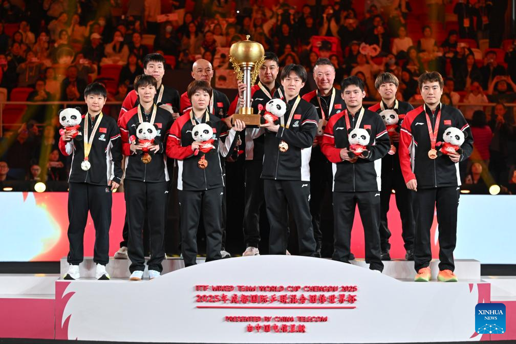 Gold medalists team China pose during the awarding ceremony at the ITTF Mixed Team World Cup 2025 in Chengdu, southwest China's Sichuan Province, Dec. 7, 2025. (Xinhua/Xu Bingjie)