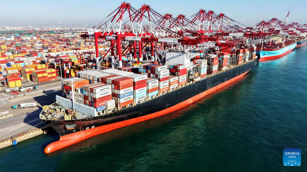 An aerial drone photo taken on Dec. 8, 2025 shows cargo ships at Qianwan Port in Qingdao, east China's Shandong Province. (Photo by Yu Fangping/Xinhua)