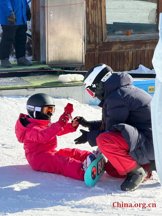 An adult helps a young child with ski gear at a ski resort in Chongli district of Zhangjiakou, northern China's Hebei province, Dec. 7, 2025. In recent years, the local authorities in Chongli have focused on improving facilities to encourage more families and children to participate in winter sports. [Photo by Liu Caiyi/China.org.cn]