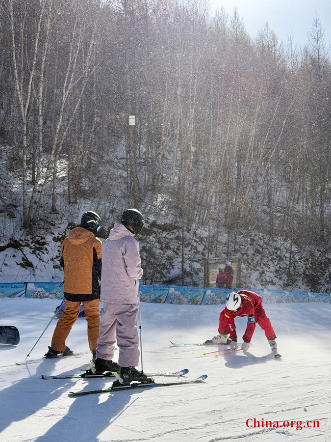Two learners watch an instructor demonstrate proper technique at a ski resort in Chongli district of Zhangjiakou, northern China's Hebei province, Dec. 7, 2025. Local resorts have expanded training services to ensure safer participation for beginners entering the sport. [Photo by Liu Caiyi/China.org.cn]