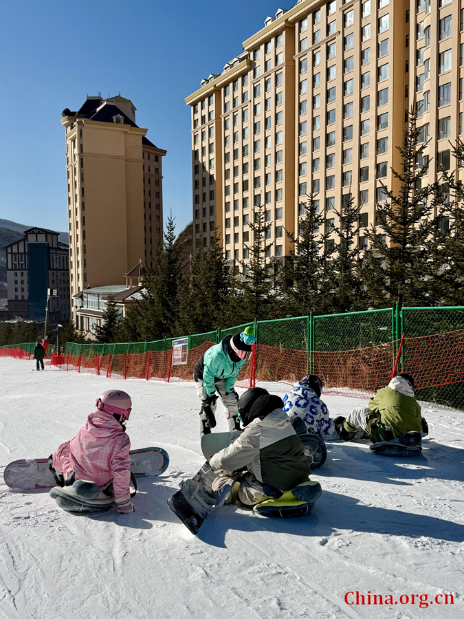 Beginners listen to an instructor while adjusting their gear at a ski resort in Chongli district of Zhangjiakou, northern China's Hebei province, Dec. 7, 2025. The area has expanded access to the sport by improving training facilities and rental services. [Photo by Liu Caiyi/China.org.cn]