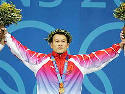 Podium de la catégorie des 69 kg messieurs d'haltérophilie des Jeux Olympiques d'Athènes: